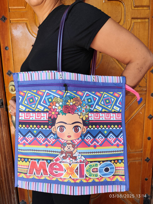 Plus que 1 !Sac cabas grand format rend hommage à la culture mexicaine avec un design vibrant et joyeux. À l'avant, on retrouve une illustration kawaii de Frid...
