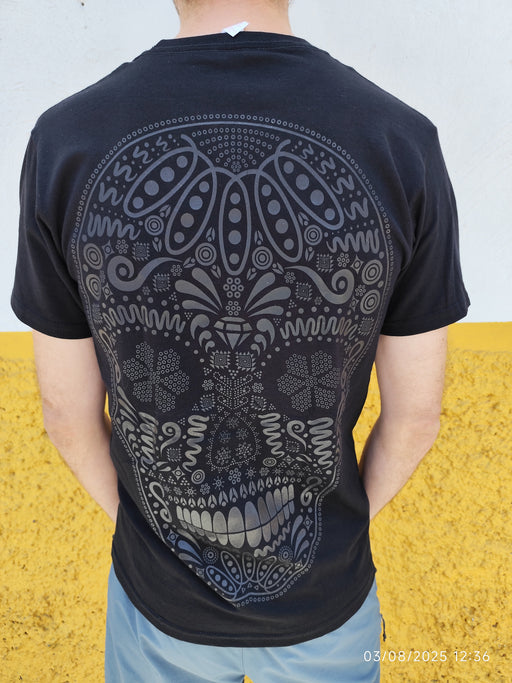 Plus que 1 !Ce t-shirt noir présente un design spectaculaire de calavera (crâne mexicain) en grand format, à la fois au recto et au verso. Inspiré par l'esthét...