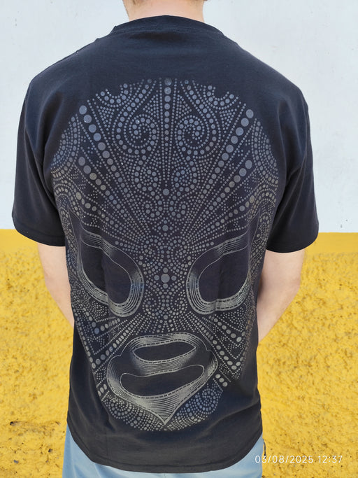 Rupture de stockCe t-shirt noir saisissant met en valeur un grand masque stylisé de luchador (catcheur mexicain) en pointillés blancs à l’avant, formant un motif s...