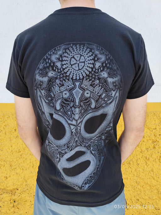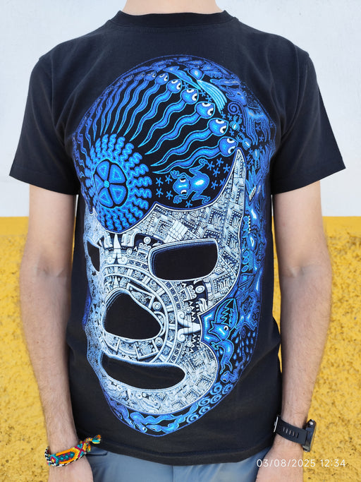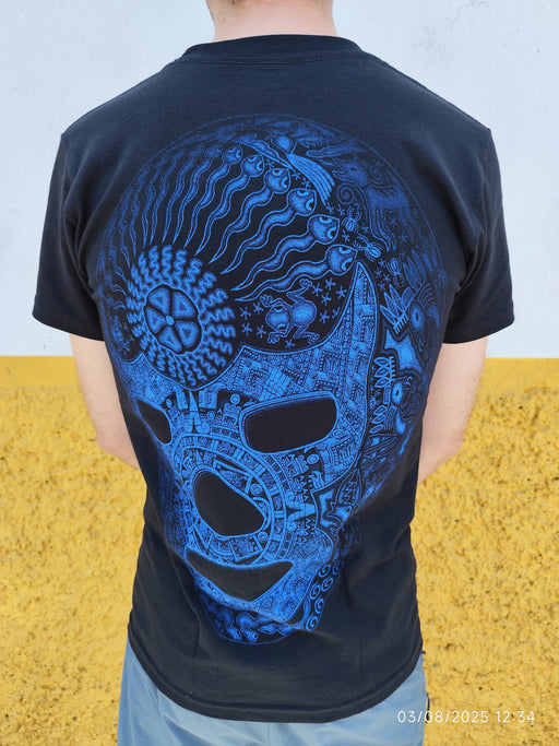 Plus que 1 !Ce t-shirt noir saisissant présente une œuvre graphique inspirée de la lucha libre mexicaine, fusionnée avec des motifs aztèques et cosmiques dans ...