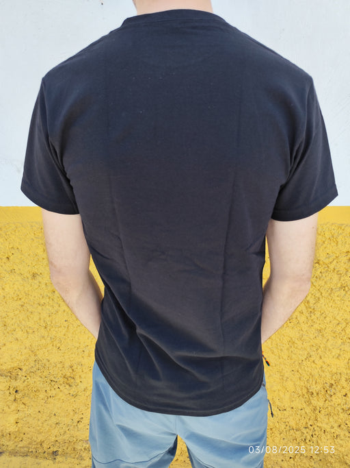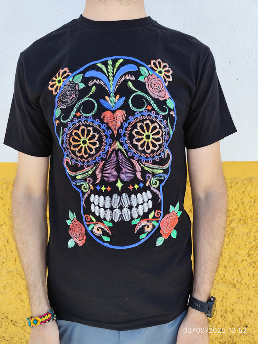 Rupture de stockCe t-shirt noir arbore une superbe sérigraphie artisanale représentant une calavera (crâne mexicain) riche en couleurs, symbole fort du Día de los ...