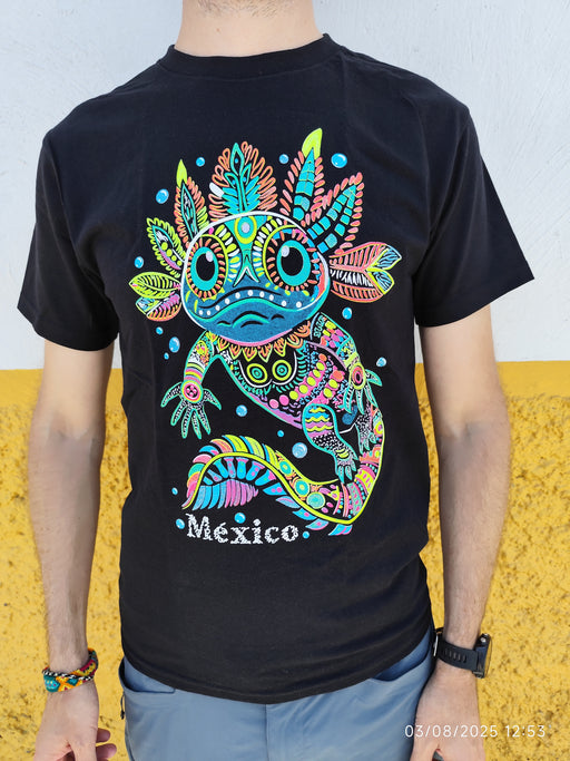 T-shirt mexicain noir avec axolotl coloré