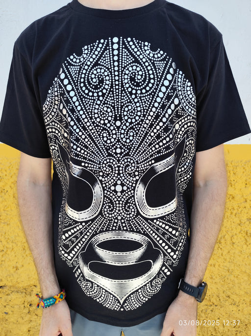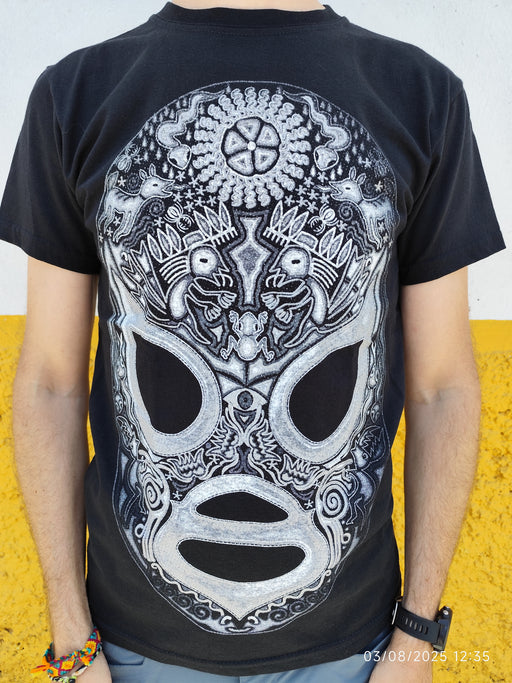 Plus que 1 !Ce t-shirt noir arbore un design saisissant représentant un masque de lucha libre stylisé, fusionné avec des motifs inspirés de l'art huichol du Me...